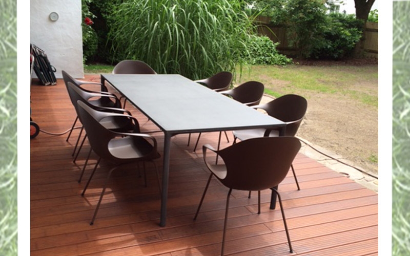 In armonia con l'impatto essenziale dell'interno, abbiamo arredato la veranda con un tavolo in fibra di cemento grigio antracite con gambe sottili e affusolate per ammorbidire l'impatto. Ad addolcire il tutto ci pensano le sedie di design di Kristalia di un caldo color cacao. E la cena bavarese può essere servita !
