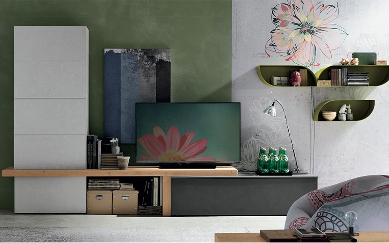 Tomasella propone una moderna e simpatica composizione zona giorno, composta da contenitori in materico cemento chiaro e cemento scuro, e un piano Panka in materico nodato chiaro. I pensili petalo in metallo laccato opaco oliva.