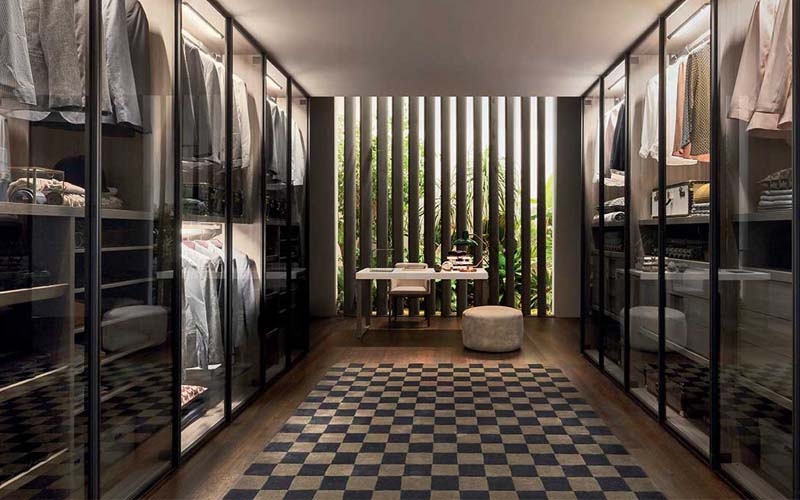 Il contenitore nasconde le cose, la cabina armadio le espone. L'attenzione nei confronti degli accessori moda ci porta a impreziosire lo spazio designato al contenitore con una serie di scomparti e ripiani dedicati alle passioni personali.