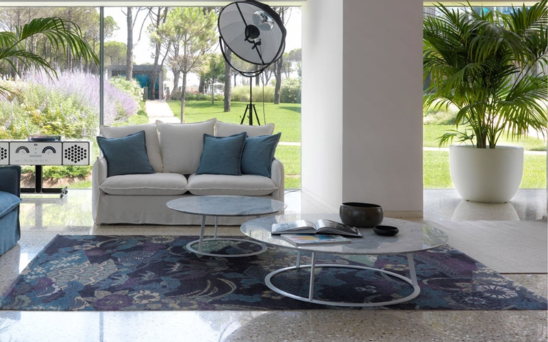 Nel rapporto fra salotto e tavolino ha un ruolo significativo anche il tappeto, perchè riproporziona gli spazi pieni e vuoti creando la giusta armonia fra i diversi elementi. Con la complicità del colore.