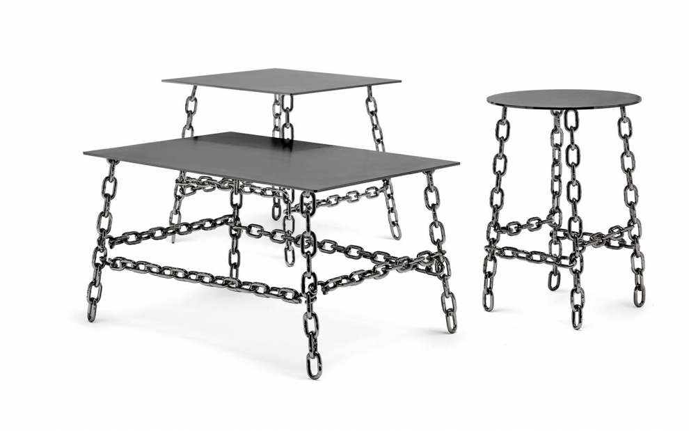 Tavolini Sing Sing di Mogg disponibili in 3 dimensioni. La catena è stata resa rigida per realizzare le gambe di questi tavolini. Disponibili nella finitura nichel nero lucido e brunito opaco.
