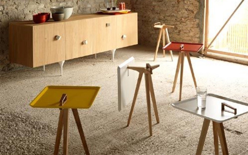 Servolino/Servolone di Miniforms è una collezione di tavolini che svolgono due funzioni allo stesso tempo, piano d'appoggio e contenitore. Grazie al vassoio estraibile, il tutto è facilmente trasportabile attraverso il manico.