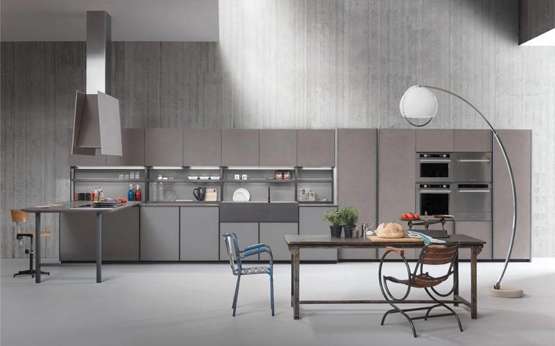 Xp di Zampieri Cucine è un modello aperto sul living che ha un telaio strutturale in alluminio con finitura ossidato nero; le ante grigie senza maniglie creano una parete colorata. La grande armadiatura permette do contenere gli elettrodomestici o la dispensa.