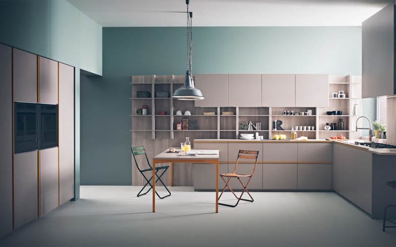 Tweet di Zampieri si caratterizza dalla boiserie che suggeriscono il nome alla cucina, riprendendo il simbolo #, creando un collegamento tra i pensili e il piano di lavoro. Massima flessibilità, grazie ai sistemi modulari, le colonne con anta a scomparsa e una particolare anta con gola disponibile in diversi colori.