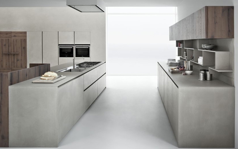 Line K di Zampieri è la cucina formata da due blocchi lineari con i piani e le ante delle basi interamente in resina di cemento corda, un materiale altamente compatto, resistente e dalla straordinaria impermeabilità, realizzato con monocomponenti atossici a base d'acqua e steso manualmente.