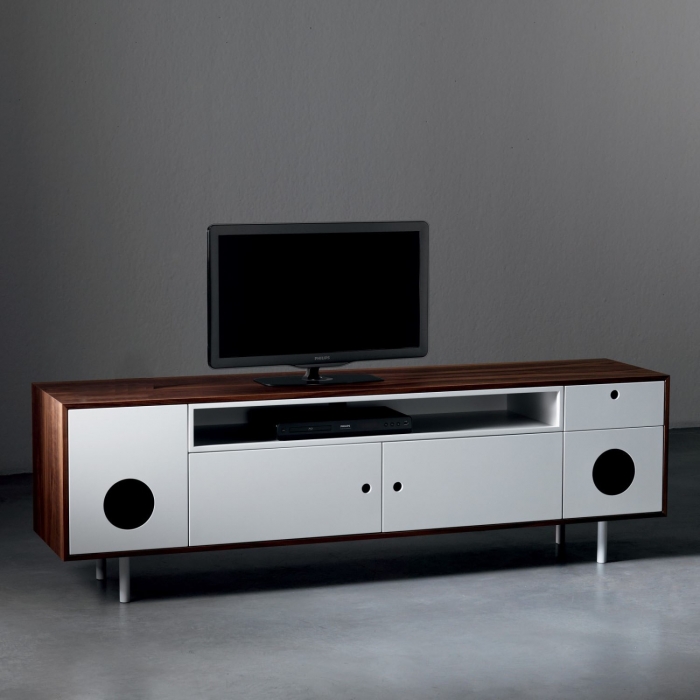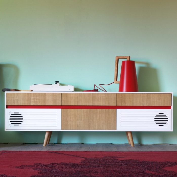 Caixa di Miniforms, credenza con casse integrate, da utilizzare anche come porta tv. Mobile dotato di Wireless Bluetooth Audio Receiver in grado di interagire con qualsiasi fonte sonora sprovvista di fili ma completa di Bluetooh. Due entrate stereo gestibili con telecomando, microfono, controllo alti e bassi, indicatore led acceso/spento, alimentatore internazionale per una compatibilità mondiale, commutazione comandi vocale.