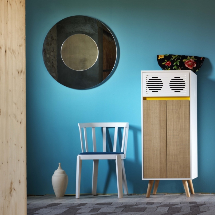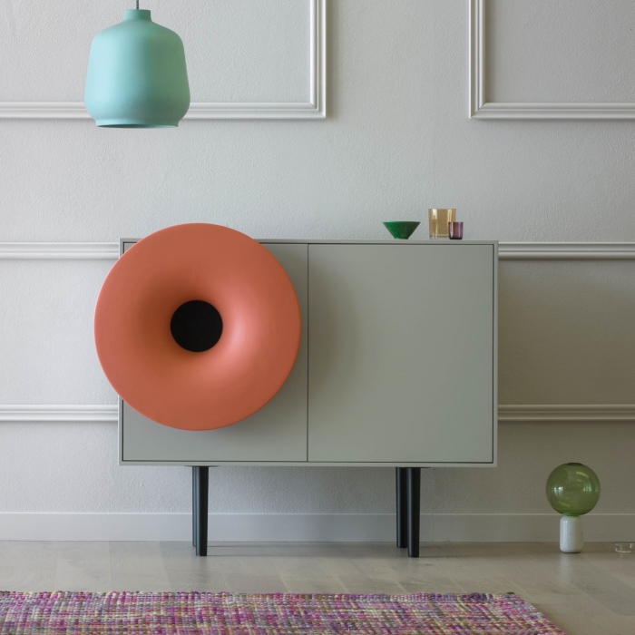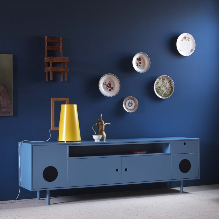 Skap di Miniforms, credenza e madia con impianto audio integrato e altoparlanti sistemati nelle ante. Il sistema Wireless Bluetooth Audio Receiver consente di far interagire qualsiasi fonte sonora dotata di Bluetooh con l'impianto installato nel mobile, senza l'ausilio di cavi, fino ad una distanza di 10 m.