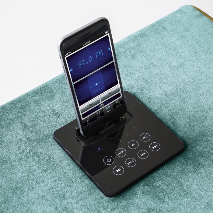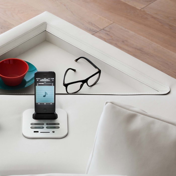 Divano James di Felis, divano angolare con impianto audio integrato con casse acustiche e subwoofer disposti all'interno dell'elemento ad angolo. Ingressi USB e AUX, alloggio per SD-car, dock-station compatibile con iPhone e iPod, tecnologia Bluetooh per la trasmissione di musica senza cavi direttamente dal cellulare.