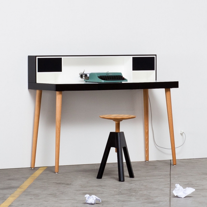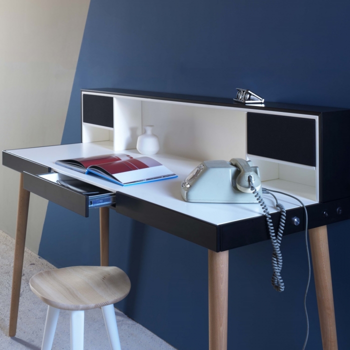 Mardino di miniforms, scrittoio scrivania per home office con impianto audio hi-fi integrato. Predisposizione laterale per il collegamento dei dispositivi audio. Tasto per l'accensione e il controllo in remoto del volume. Spina in dotazione compatibile con prese tripolari di tipo L.