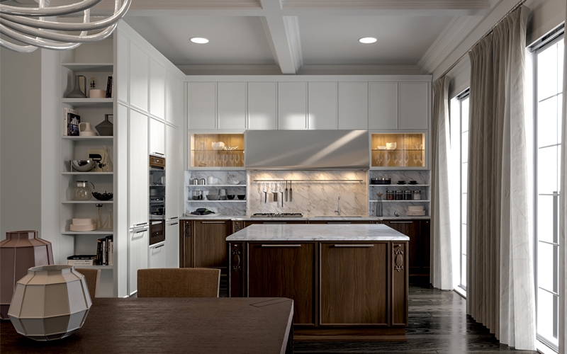 Il modello di cucina Estetica di Home Cucine, è caratterizzata da leggere cornici che la rendono adattabile a diversi spazi, dal moderno dove coabitano benissimo particolari in finitura acciaio ad ambienti dal richiamo più classico con dettagli come la cornice cappello oppure gli estraibili con fregio.