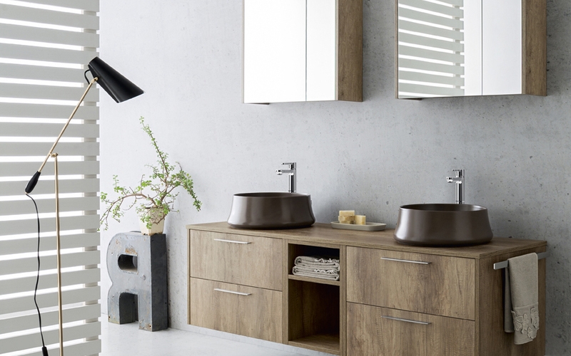 La collezione si completa di specchi retroilluminati e contenitori, corpi illuminati, pensili, vani a giorno, colonne e dall'ampia e raffinata offerta di coordinati tessili.
