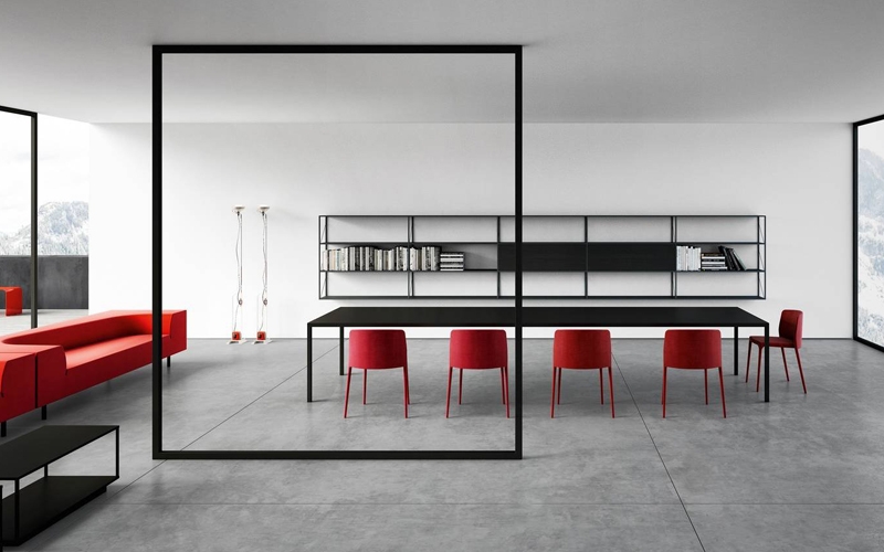 Quando la superficie di un ambiente è ampia ma non si vuole spezzarne la fluidità o è ridotta e per questo è necessario sfruttare al massimo la permeabilità alla vista e alla luce, può essere utile trasformare la libreria, in versione freestanding a tutta altezza o bassa, in un funzionale setto divisorio.