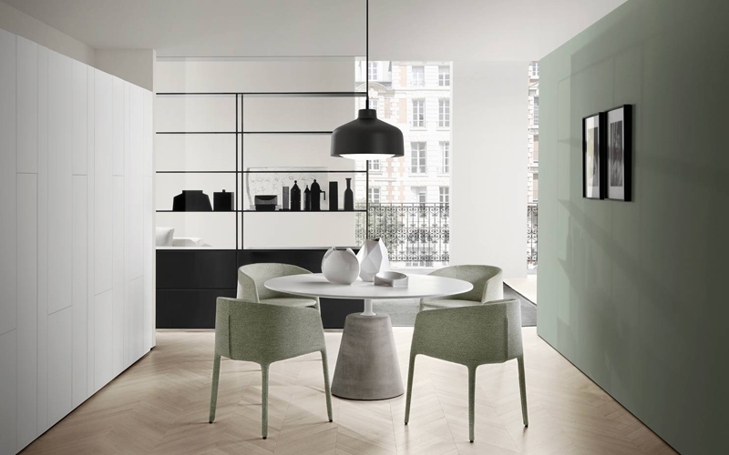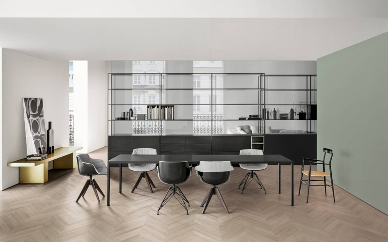 Ispirazione Paris – decisi contrasti black and white, dettagli materici, discreti tocchi cromatici – per questa allungata composizione Minima 3.0 by Metrica (design Bruno Fattorini) di MDF Italia, che separa senza soluzione di continuità visiva e luminosa l’area pranzo dal resto della zona giorno. La spalla di vetro trasparente a tutta altezza funziona da invisibile schienale e definisce spazi e funzioni. A servizio della convivialità, grazie ai contenitori per le stoviglie e ai ripiani per piccoli elettrodomestici e utensili, la libreria ha i montanti verticali in estrusione di alluminio nella finitura verniciata grigio grafite, tinta con cui sono finite anche le mensole. Sempre di alluminio – nello spessore minimo di 1,5 mm – e profonde 33 cm. I contenitori sottostanti sono laccati opachi grigio grafite e chiusi da ante sia a ribalta sia a battente e da cassetti.