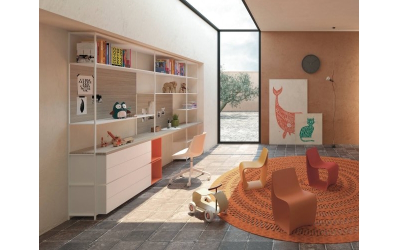 Il sistema Minima 3.0 by Metrica (design Bruno Fattorini) di MDF Italia si adatta perfettamente anche alla stanza dei bambini, assolvendo al compito di organizzare giochi e libri con la medesima eleganza minimale degli ambienti dei grandi. Una soluzione che cresce con l’età dei piccoli adeguandosi alle diverse necessità, semplicemente aggiungendo o rimuovendo gli elementi contenitivi in appoggio. Questa libreria di ispirazione Granada ha struttura portante (profonda 33 cm) in estrusione di alluminio verniciato bianco opaco e mensole estremamente sottili di alluminio anch’esso verniciato bianco opaco. I contenitori, profondi 45 cm, sia a giorno sia chiusi da cassetti, sono in laccato opaco micro-goffrato bianco e arancione, mentre il piano scrittoio e lo schienale sono in variante essenza legno naturale, che aggiunge calore e contemporaneità alla composizione.