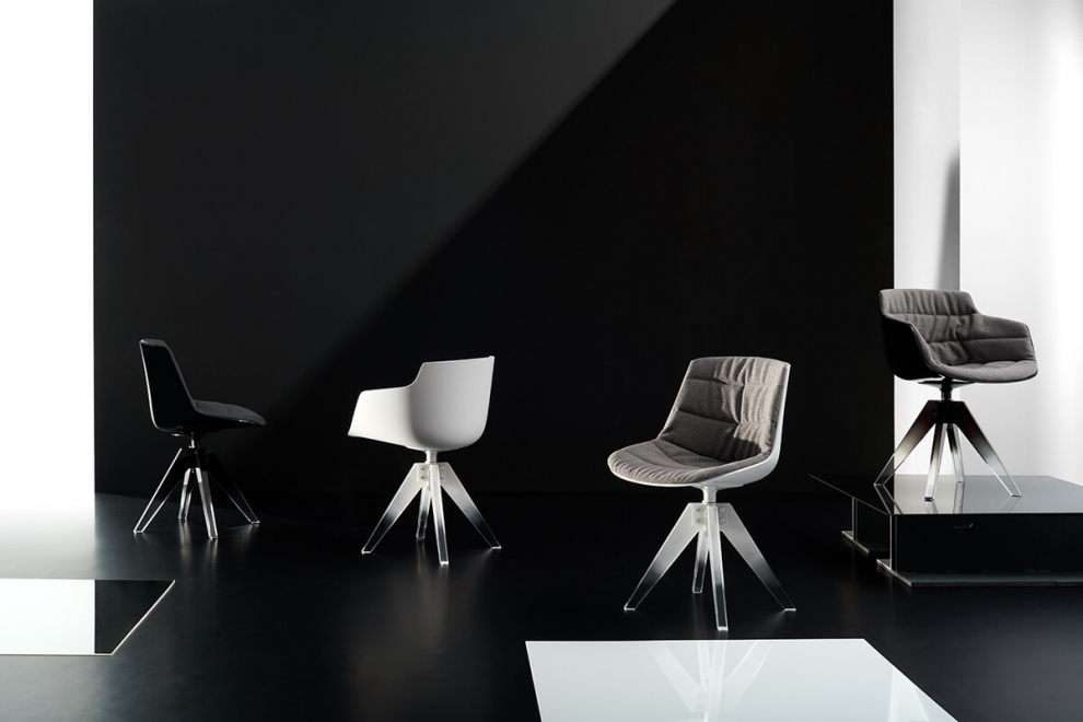 Flow 10th, iconica versione delle sedute Flow Chair e Flow Slim, con scocca posteriore opaca bianca e gamba sabbiata o scossa posteriore in nero lucido con gamba verniciata nera. La particolarità di Flow 10th è che si presenta con un nuovo e originale basamento 10th in metacrilato. L’utilizzo di questo materiale dona alla seduta l’illusione di galleggiare nell’aria.