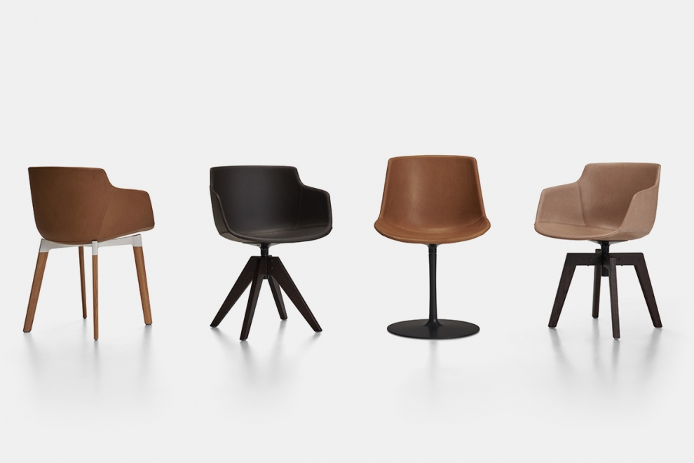 Flow Leather disponibile in due finiture di pelle Nuvola e Anilina. Speculari nella sua applicazione, la pelle Nuvola, presentata in 11 tonalità, è stata pensata per arredare ambienti contract come ristoranti, uffici, hotel si distingue per una texture punzonata all’interno e liscia all’esterno, mentre Anilina proposta in 7 differenti tonalità di pelle premium, con dettagli punzonati all’esterno e liscia all’interno si inserisce perfettamente in aree living o in spazi dedicati all’home office.