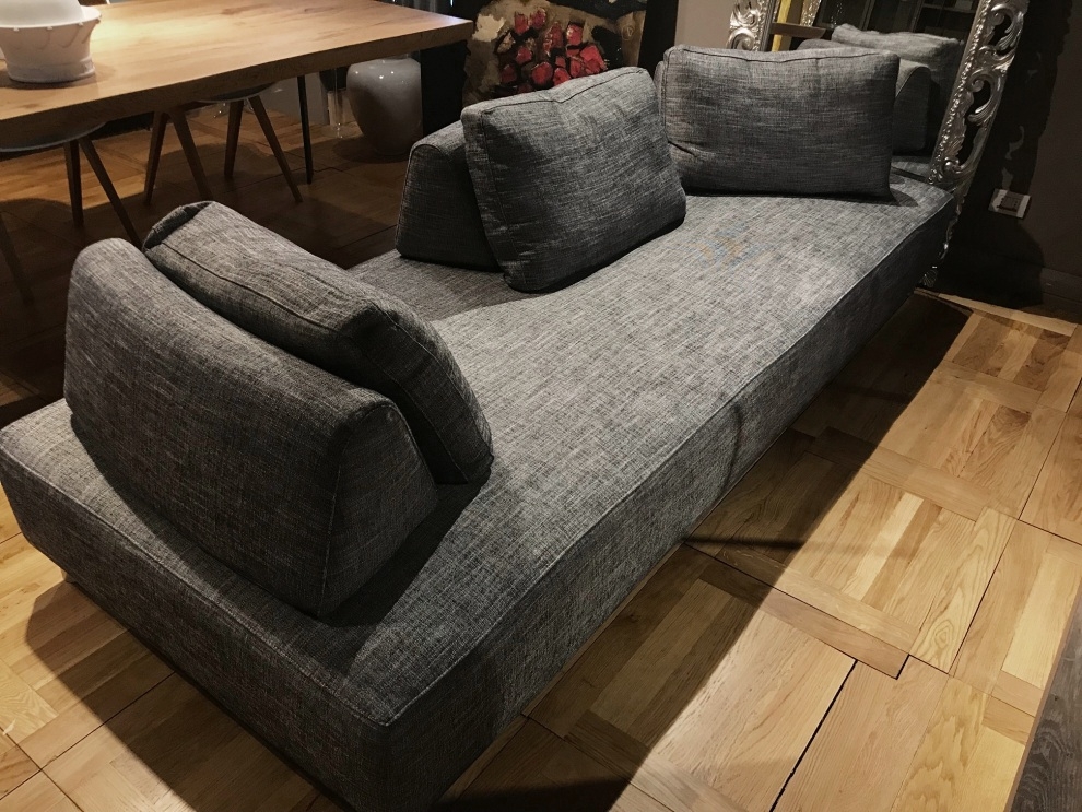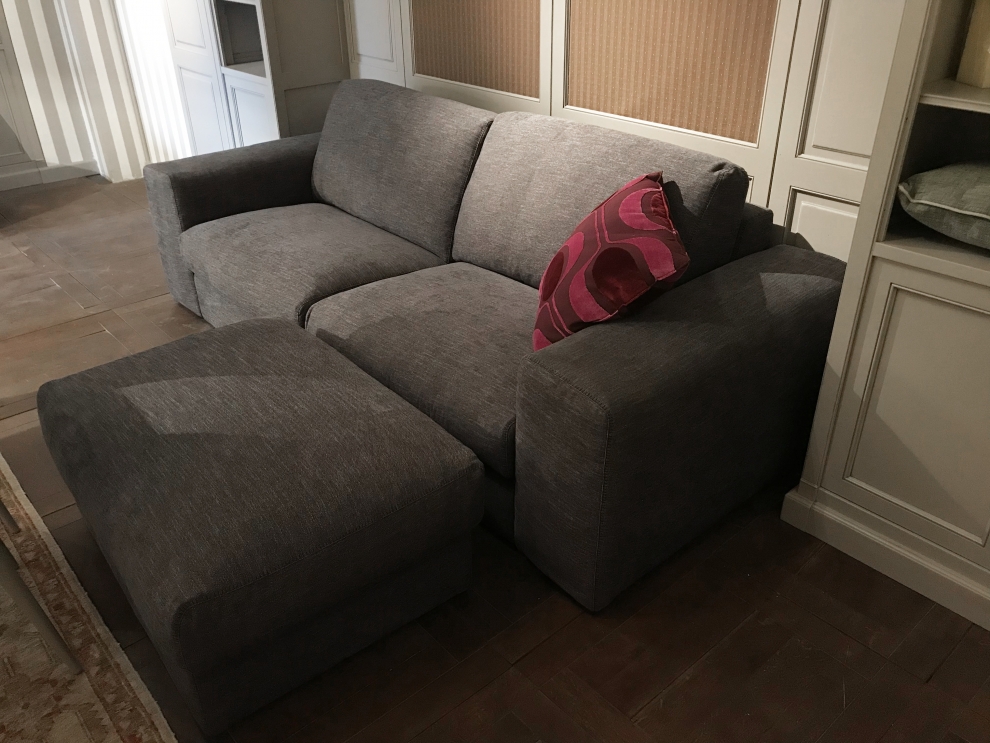 Divano e pouf Bradley di Felis in tessuto, dalle forme generose e da ampie sedute, larghi braccioli e morbidi e irresistibili cuscini. Il divano in offerta è rivestito in tessuto antracite