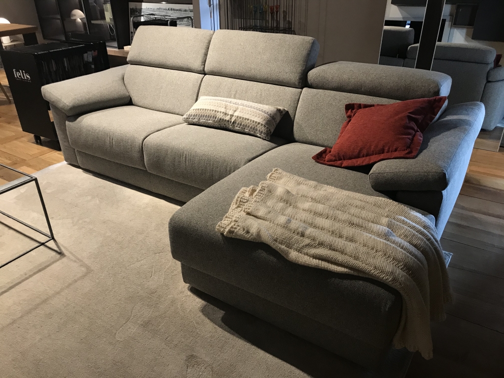 Divano Dexter di Felis con meccanismo a scivolamento consente, con un semplice movimento, di far avanzare la seduta in tre diverse posizioni, così anche il poggiatesta con movimento a cricchetto. Il divano con penisola in offerta è realizzato in tessuto.