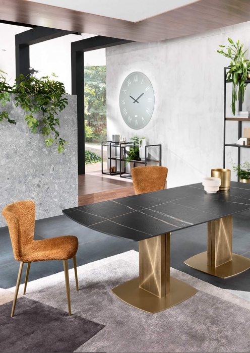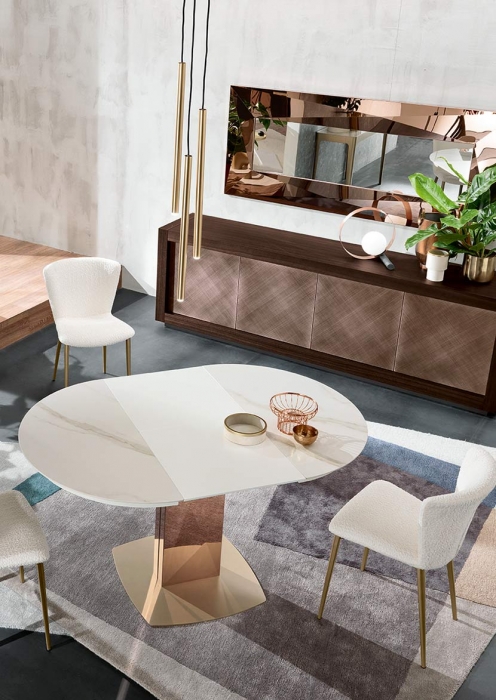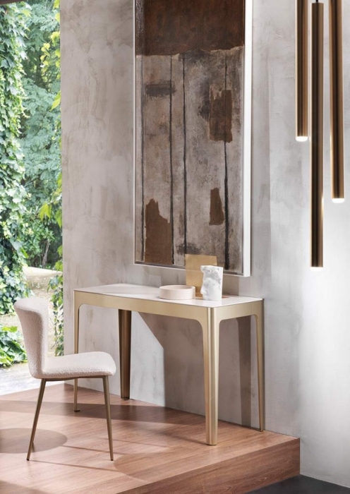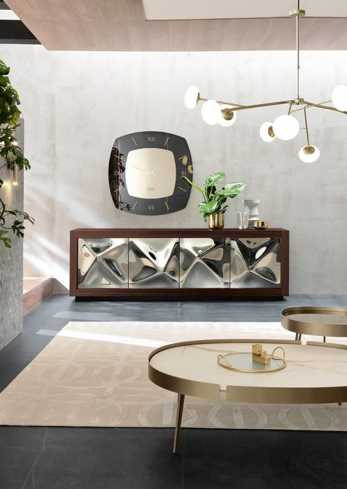 L'acciaio inossidabile dal punto di vista estetico ha un effetto originale e di grande impatto poiché riflette la luce in modo peculiare, e, grazie al trattamento con nanoceramiche, risulta inoltre estremamente resistente, antibatterico e anti impronta, oltre che ecosostenibile. In un gioco di contrasti, accanto alla brillantezza e l’uniformità cromatica dell’acciaio specchiante, si distinguono superfici ricche di venature, colori e sfumature, proposte per specchi, top di tavoli, tavolini e madie