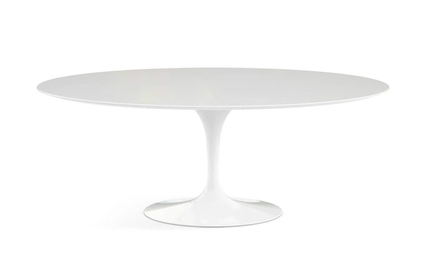 Tavolo iconico dal design Made in Italy con piano ovale in laminato bianco, basamento ovale in alluminionio bianco con sottopiano.
