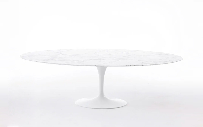 Tavolo iconico dal design Made in Italy con piano ovale in marmo di carrata bianco, basamento ovale in alluminionio bianco con sottopiano.
