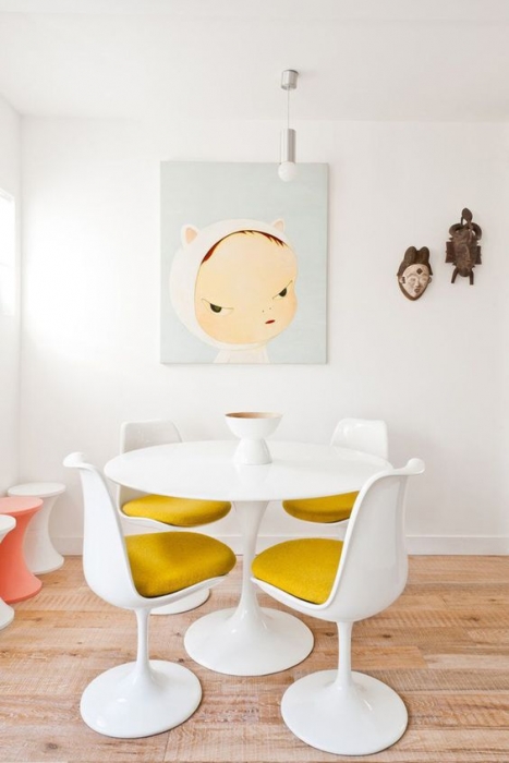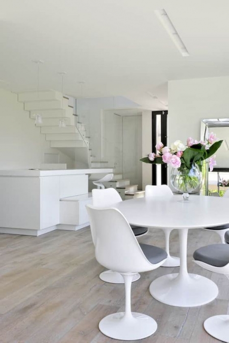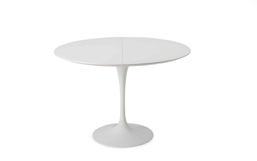Tavolo iconico dal design Made in Italy con piano ROTONDO in laminato liquido bianco, basamento rotondo in alluminionio bianco con sottopiano.