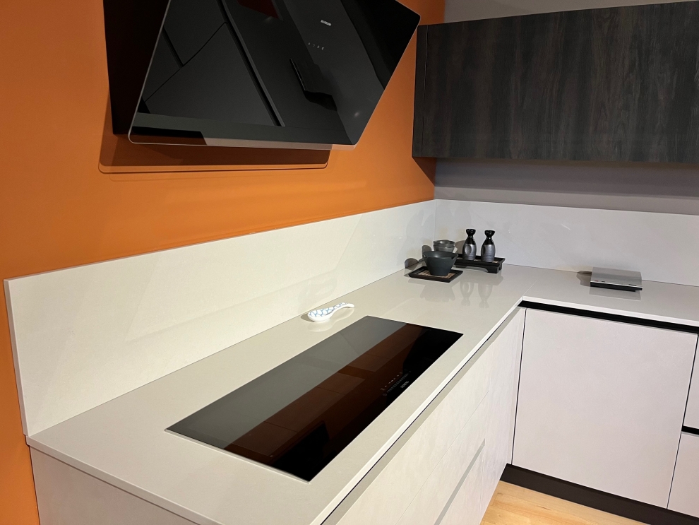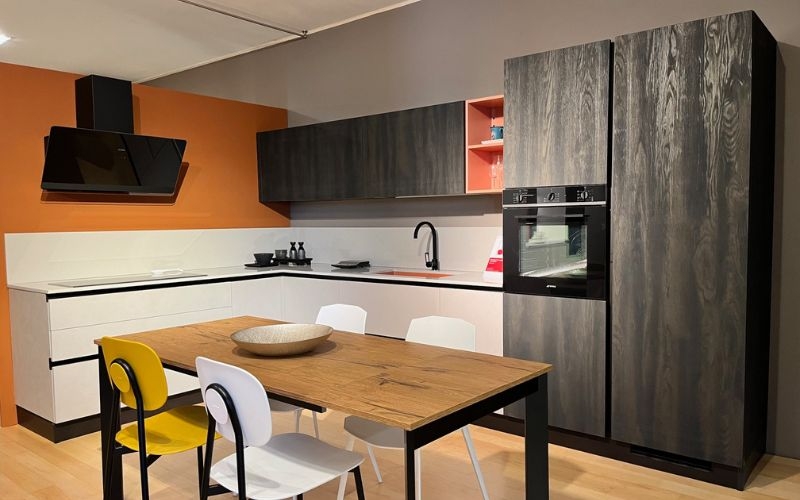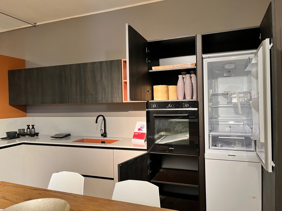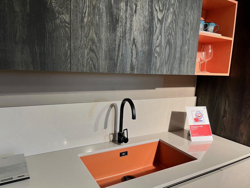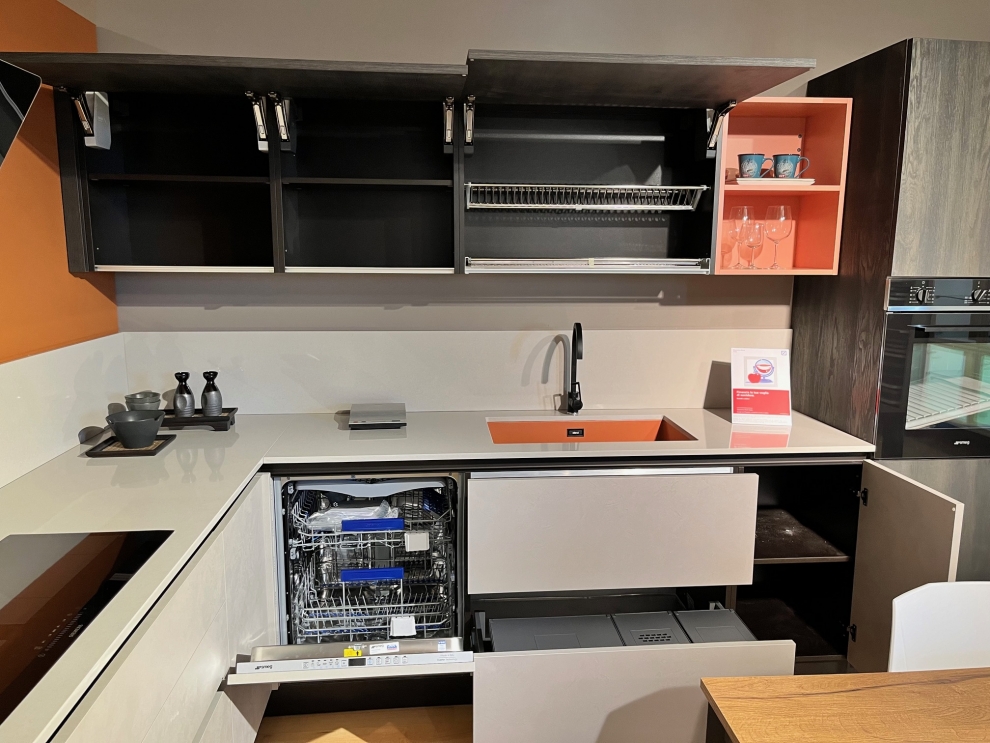 Cucina angolare dal design moderno, nata dall’unione dei modelli Genesi e Aura di Home Cucine. Le basi color Deserto si abbinano armoniosamente a gole e zoccoli finitura Brunito, mentre i pensili e le colonne in tonalità Bruciato donano eleganza. Il vano a giorno RAL 3012 aggiunge un tocco di carattere, completato dal top in Quarzo Santamargherita Grigio Perlato per un effetto raffinato e contemporaneo.