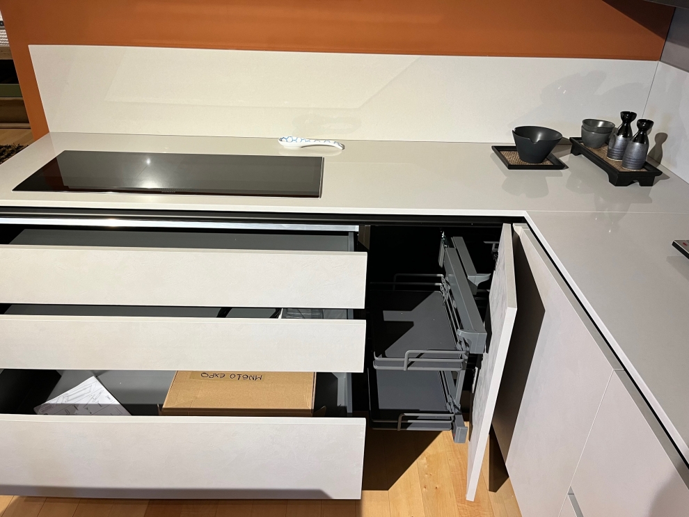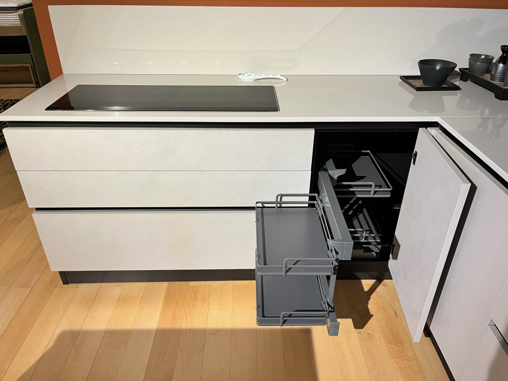 La composizione è caratterizzata da una base cm 120 2 cassetti + cesto per piano cottura, base angolo 110x65 con cesti interni estraibili, base 60 con anta per lavastoviglie, sottolavello da cm 90 con 2 cesti estraibili e base cm 45.