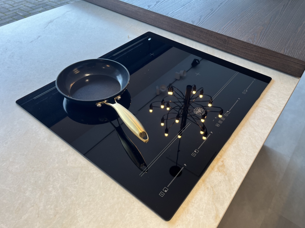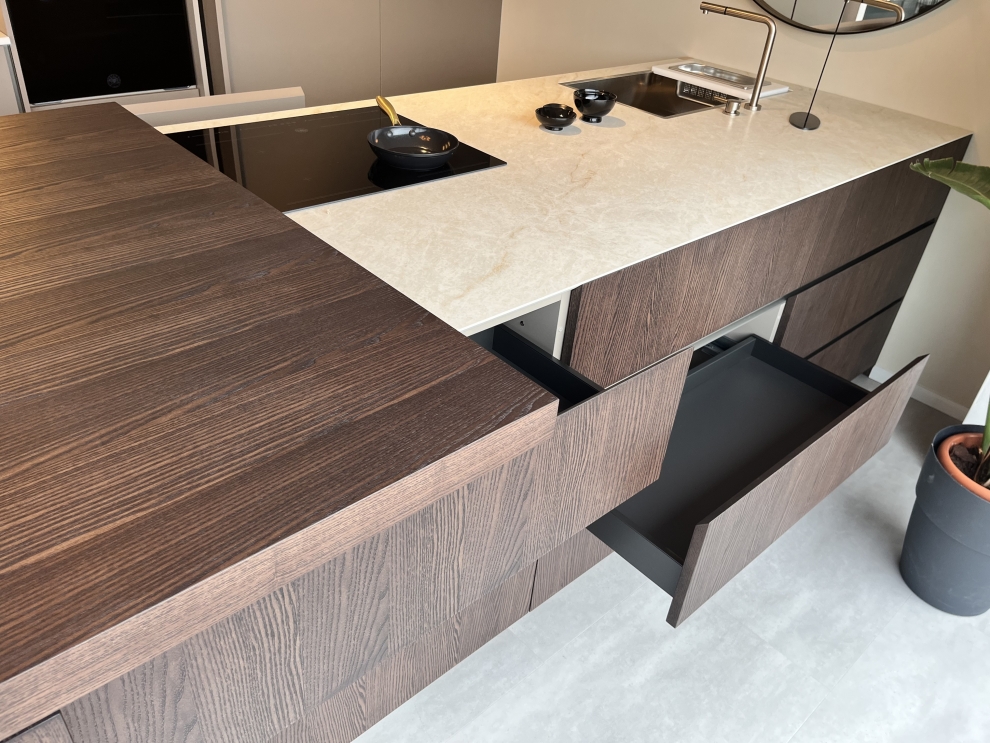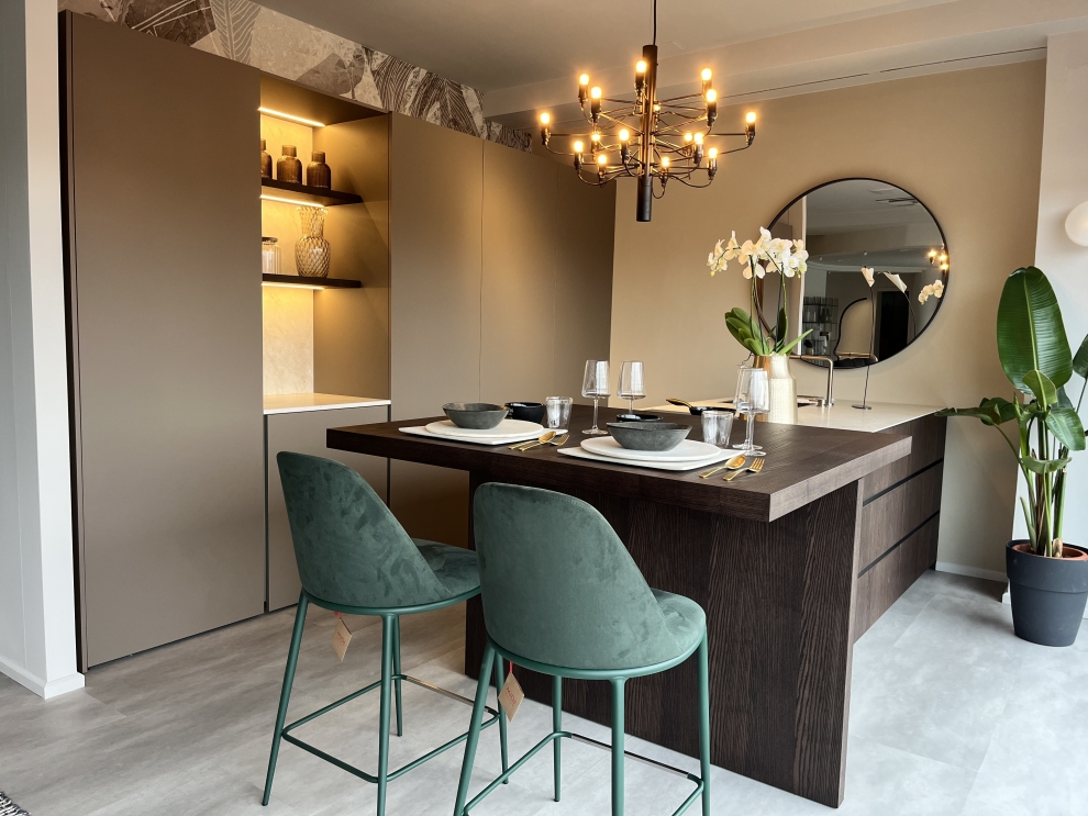 Il cuore della cucina è l'isola centrale, dotata di un pratico lavello e di un piano cottura a induzione, ideale per chi ama cucinare con efficienza. La zona snack scorrevole aggiunge versatilità, permettendo di trasformare lo spazio secondo le esigenze del momento.