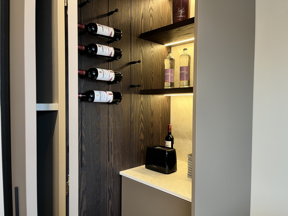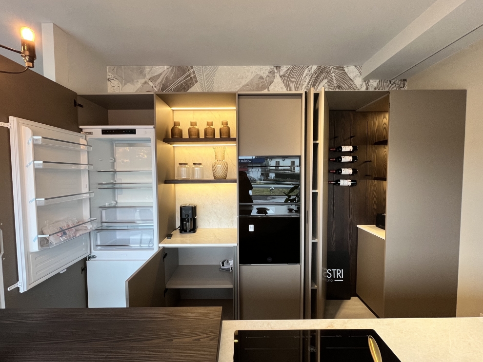Le colonne attrezzate offrono soluzioni intelligenti per l'organizzazione: una colonna forno con anta rientrante e una zona ripostiglio con kit karte portabottiglie integrato. Questi dettagli non solo ottimizzano lo spazio ma aggiungono anche un tocco di classe grazie alle mensole retroilluminate.