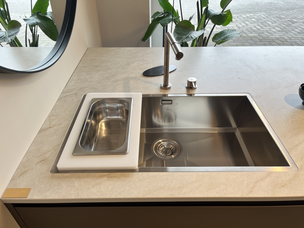 A completare la dotazione troviamo il lavello Artinox Prisma inox filotop con miscelatore Artinox circle inox spazzolato, elementi che combinano funzionalità ed estetica sofisticata.