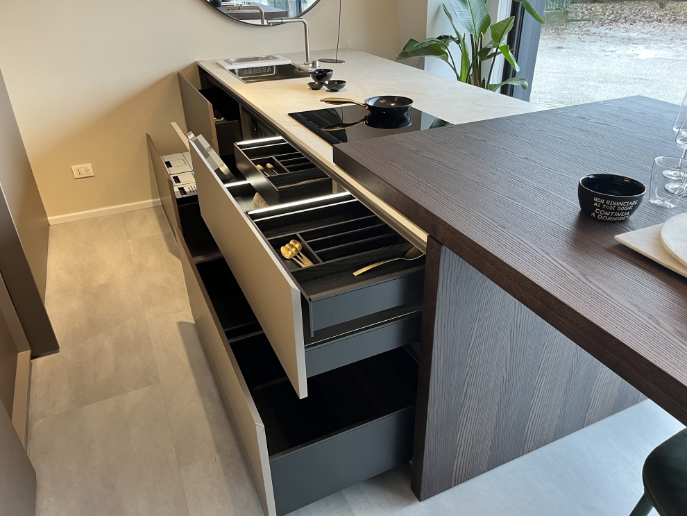 Questa cucina è attualmente disponibile in offerta per rinnovo expo: un'opportunità imperdibile per chi desidera portare nella propria casa una soluzione d'arredo esclusiva e all'avanguardia.