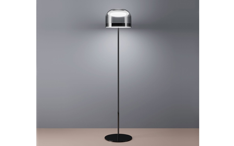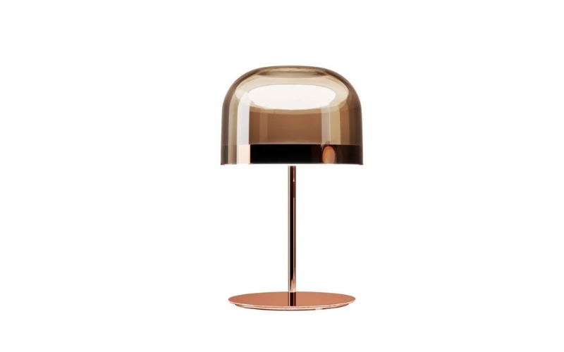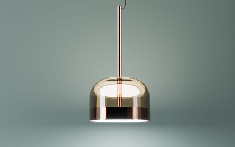 Equatore ha un design che si inspira alle classiche lampade con paralume in vetro. Il diffusore, che nelle lampade classiche alloggiavano la sorgente luminosa, in Equatore è vuoto e l’effetto luminoso è prodotto da due dischi luminosi all’interno di una fascia metallica centrale, visibile sul paralume e che richiama la linea dell’equatore. Equatore è disponibile nella finitura con calotta trasparente rosa e struttura color rame.