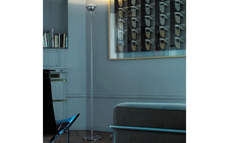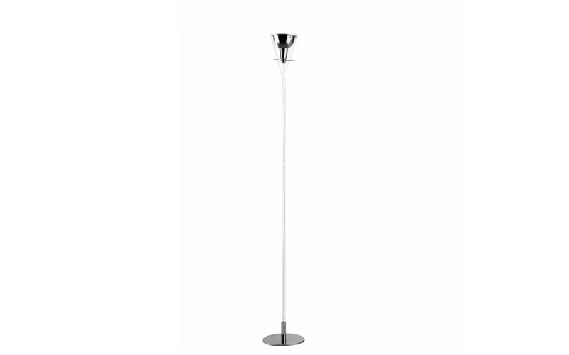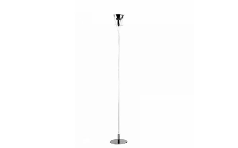 Flute lampada da terra a luce indiretta dimmerabile a pavimento con cursore a scorrimento. Stelo in vetro borosilicato trasparente. Riflettore in alluminio cromato lucido. Base e supporto riflettore in metallo cromato. Cavo di alimentazione, dimmer e spina trasparenti. Spina di tipo shuko, adattatore non incluso. Fonte luminosa non inclusa.