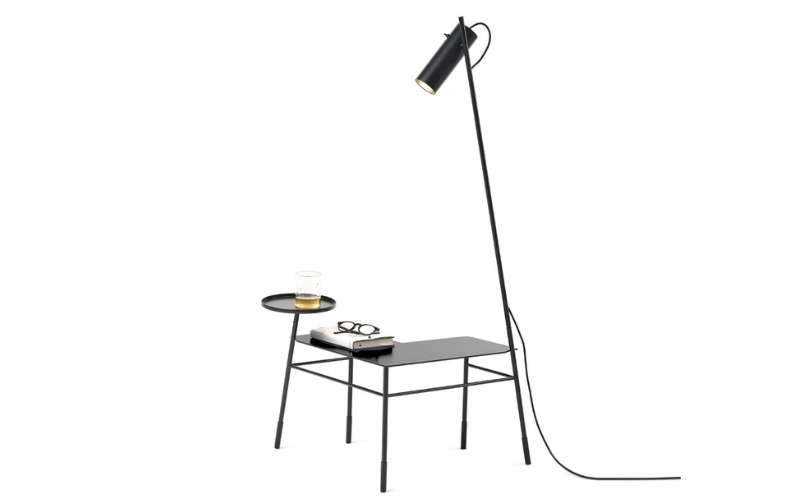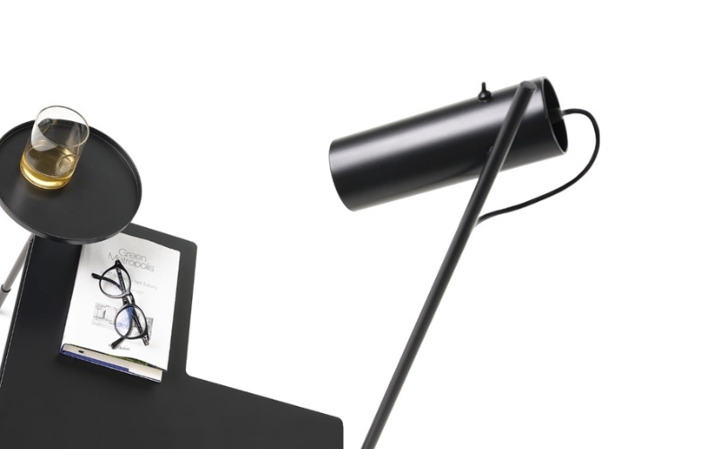 Dasè di Mogg è un tavolino angolare in metallo con lampada e vassoio. Disponibile verniciato nero, dal design elegante e leggero, molto funzionale adiacente a divani o poltrone. Un unico oggetto risolve tre funzioni: piano d’appoggio e, grazie a due delle gambe che si allungano rispetto alle altre, vassoio e lampada.