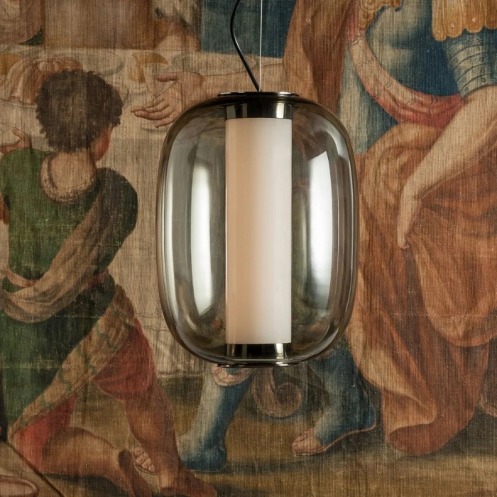 Lampada a sospensione a luce diffusa/diretta con doppia accensione dimmerabile parzialmente 1:10 V. La doppia accensione consente di illuminare separatamente la parte centrale (dimmerabile) e quella inferiore del diffusore (interruttore on-off). Montatura in metallo nichelato. Diffusore esterno in vetro soffiato. Diffusore interno in vetro pirex verniciato internamente. Cavo di sospensione in acciaio. Cavo di alimentazione nero. Rosone in metallo verniciato. Led integrato.