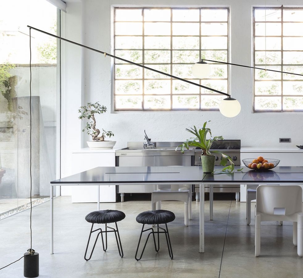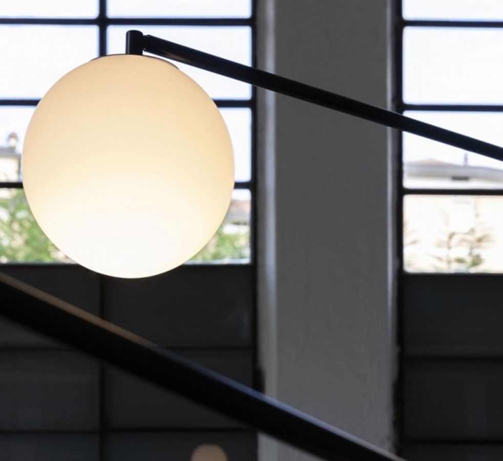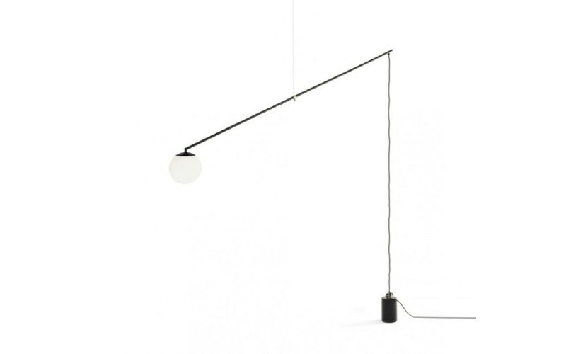 Lampada a sospensione con sottile struttura in metallo nero e cavo a soffitto. Sfera in vetro opale, peso a terra in marmo. Minimale performante, reinterpretazione che vede il segno come protagonista. Adatta sia per la zona living che la zona dining.