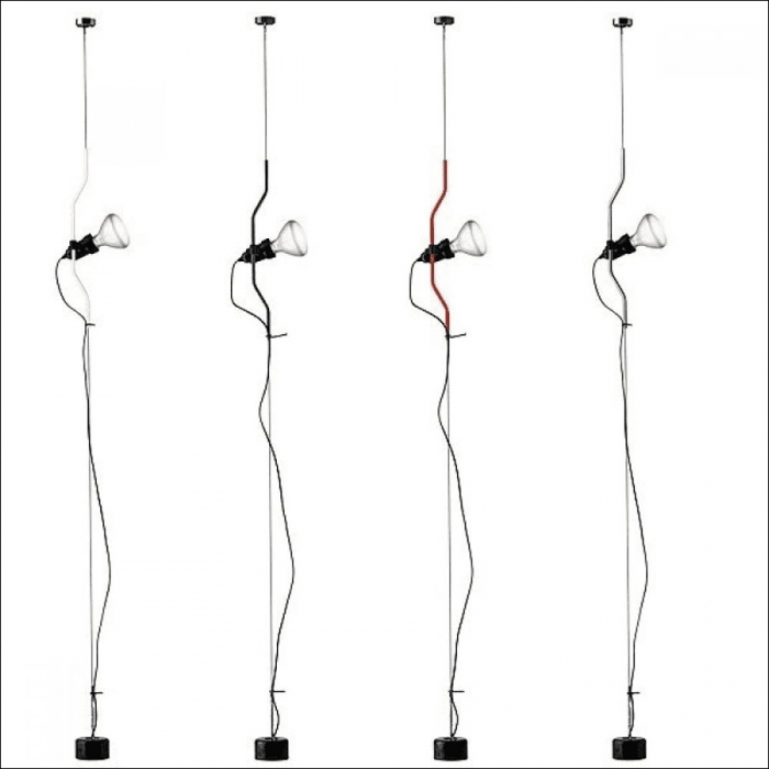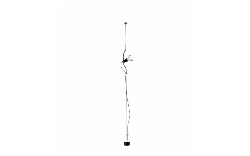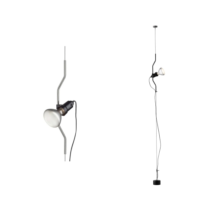 Il movimento verticale del corpo illuminante avviene tramite lo scorrimento di un tubolare di acciaio sagomato, disponibile verniciato a liquido o nichelato, su un cavetto in acciaio teso tra pavimento e plafone (lunghezza utile 4000 mm). La testa della lampada in elastomero stampato a iniezione, di colore nero, contiene l’interruttore On/Off per un utilizzo pratico e immediato.