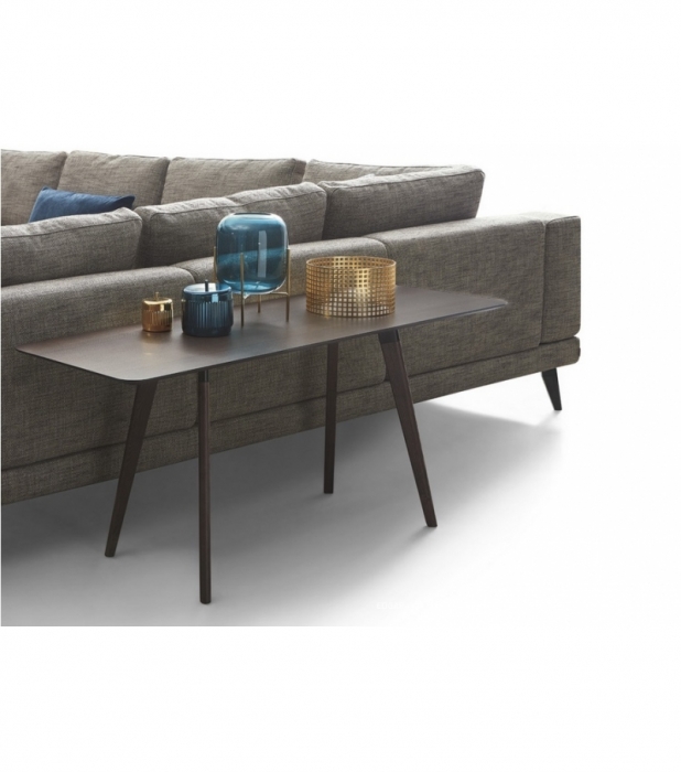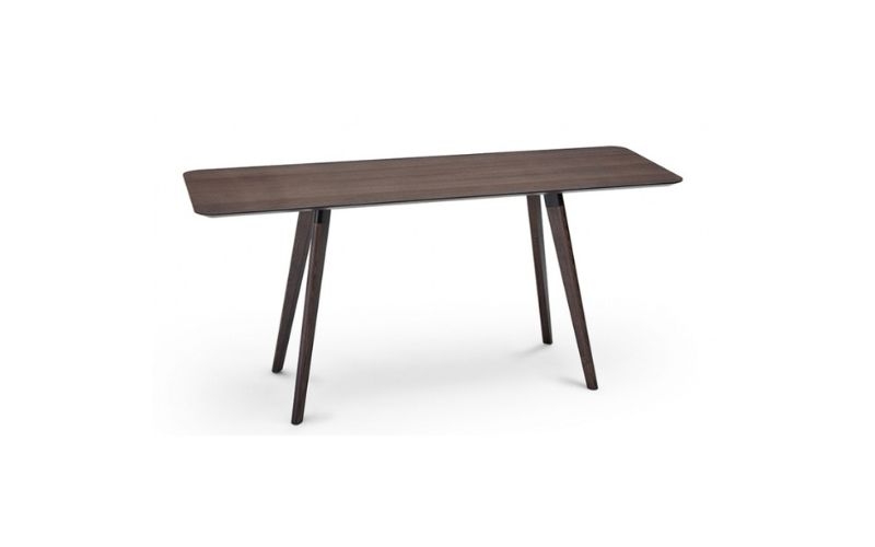 Consolle Edgar di Dema, realizzata con struttura in metallo laccato marrone scuro, gambe in frassino tinto e piano in legno impiallacciato.