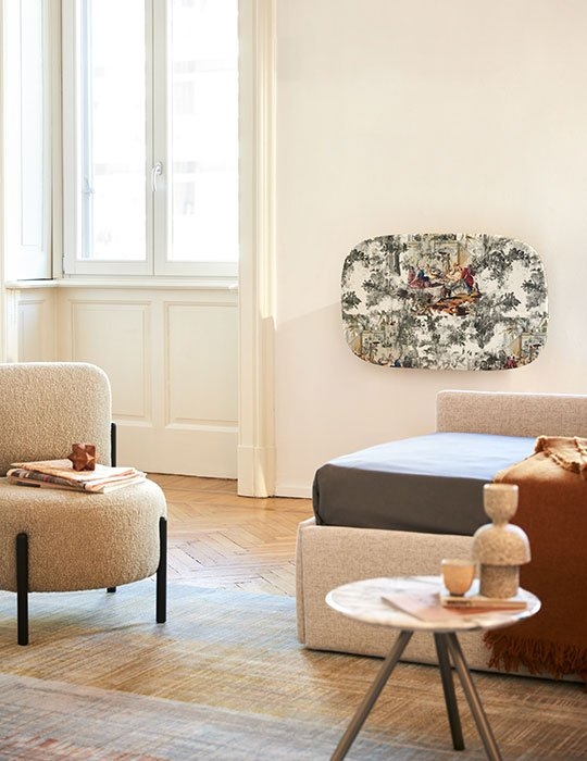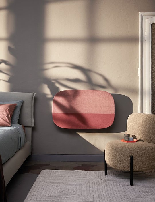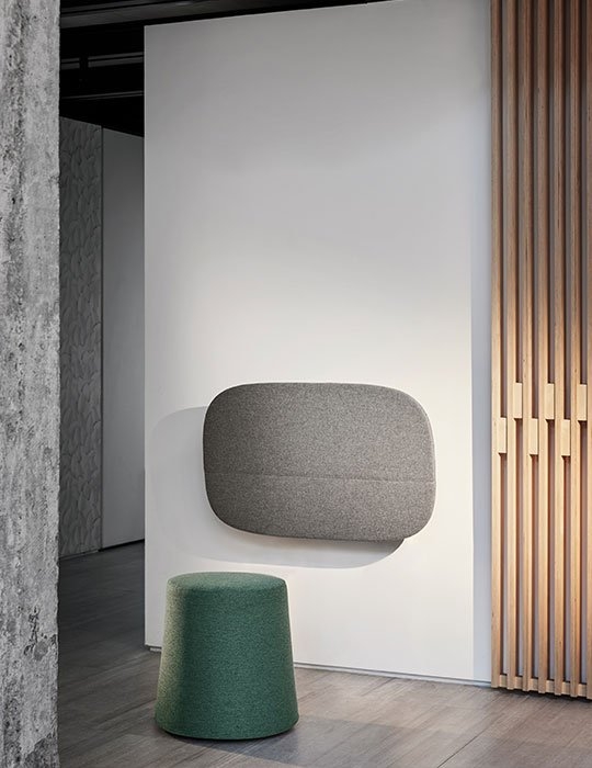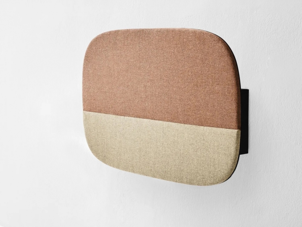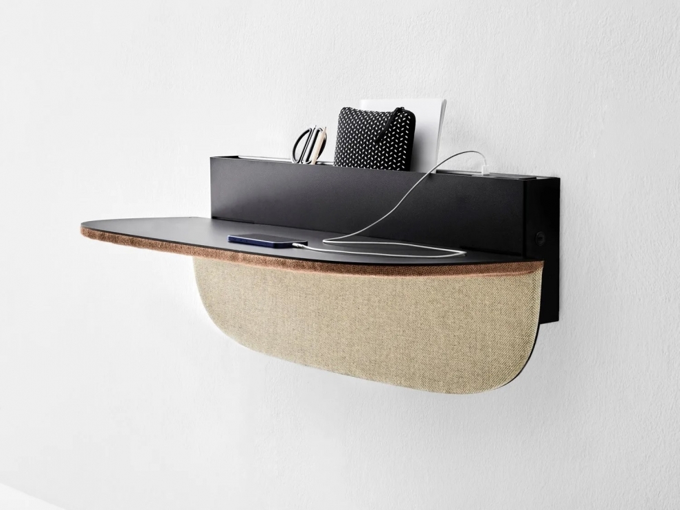Il pannello tessile a parete cela un desk compatto e super accessoriato che risponde alle nuove modalità home-office e alle necessità di trovare angoli comodi per poter lavorare a casa: una soluzione pratica, trasversale e salva spazio, che può facilmente migrare tra gli ambienti.