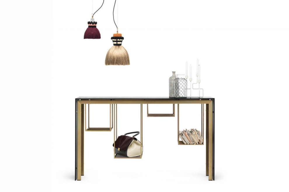 Hai esigenze particolari, dimensioni, finiture, quantità, trasporto, ecc…?Tokyo è una console e anche una panca. Struttura in metallo vani in lamiera stirata verniciati oro opaco, piano e fianchi in MDF nero. Pratico elemento, dotato di piani da appoggio fruibili appesi sotto il top, minimali e rigorosi.