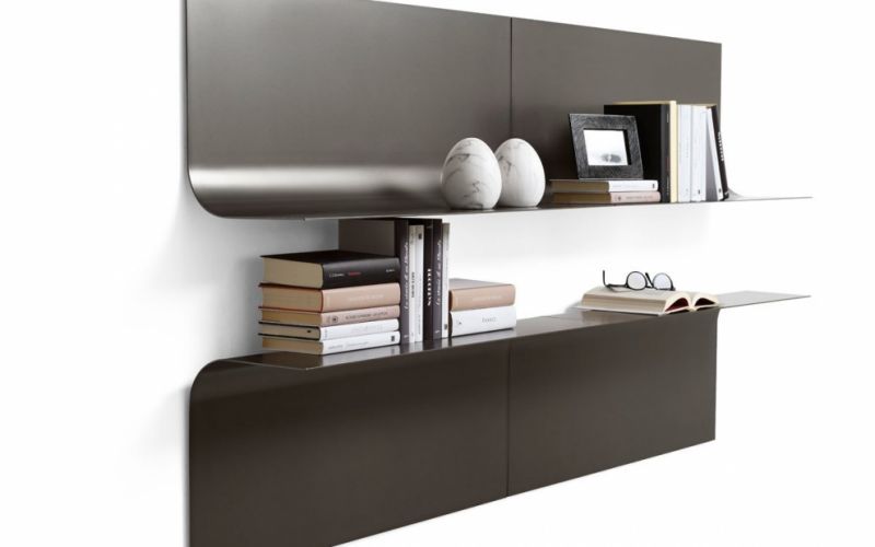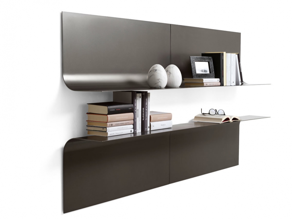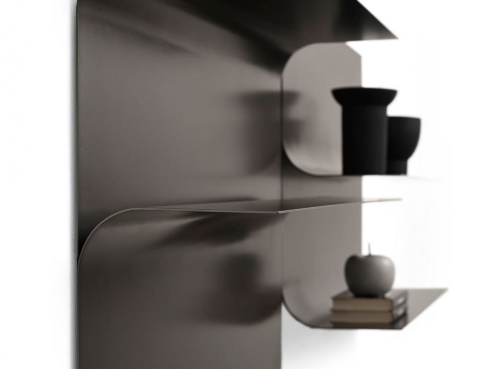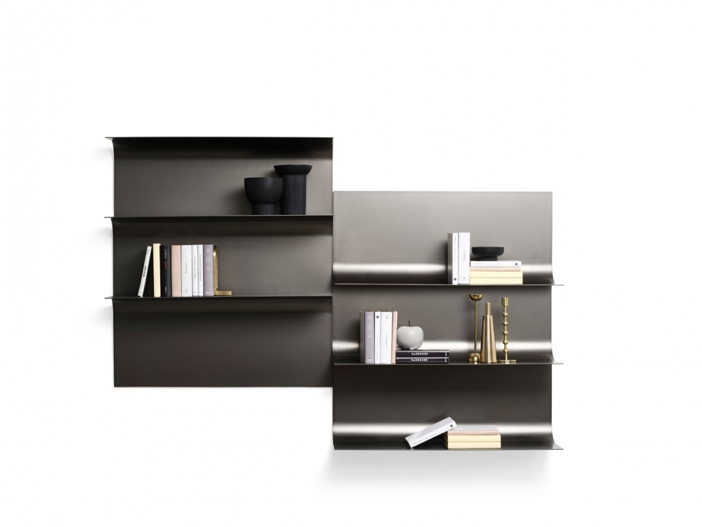 Una sottile lamina che, come le pagine di un libro si sfogliano dal muro. Il risultato è un elemento molto semplice formalmente ma estremamente versatile. Con un solo modulo che può essere montato anche capovolto, è possibile avere numerose combinazioni. Richiede fissaggio a parete.