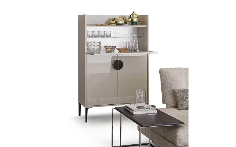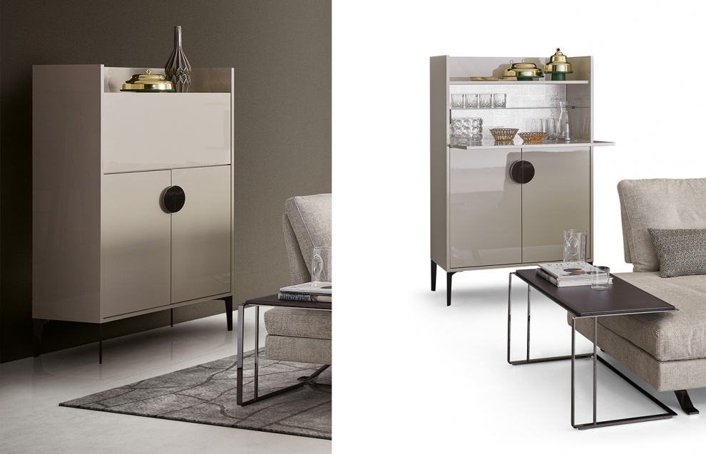 Hai esigenze particolari, dimensioni, finiture, quantità, trasporto, ecc…?Contenitore a due ante a libro con ripiano a giorno e anta a ribalta, ripiani interni spostabili, all’interno dell’anta a ribalta ripiano in vetro e fondo a specchio.