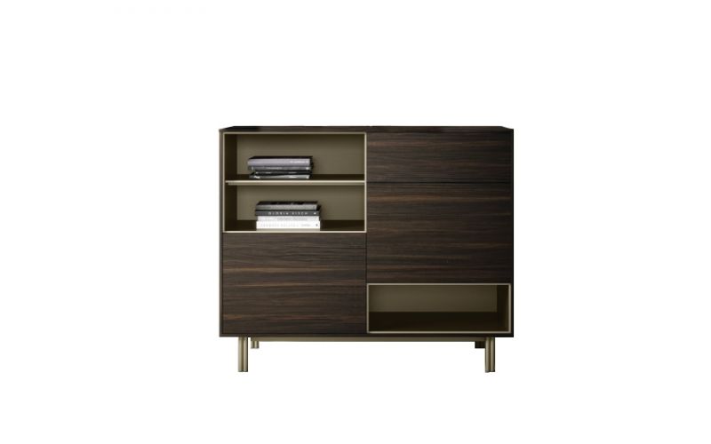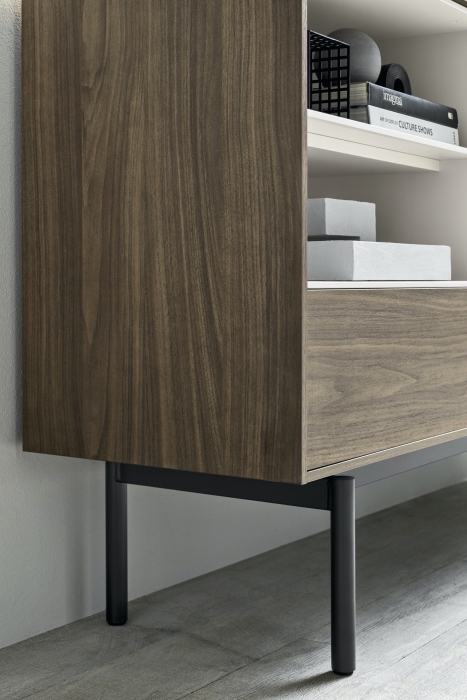 Il contenitore affianca vani chiusi e vani aperti. La scocca si abbina infatti sia ai frontali sia ai vani a giorno, per creare un gioco di pieni e di vuoti che arreda con personalità qualsiasi ambiente della casa. La madia, disponibile in tre varianti, è completata dal basamento, da scegliere nelle due altezze 15 o 24 cm.