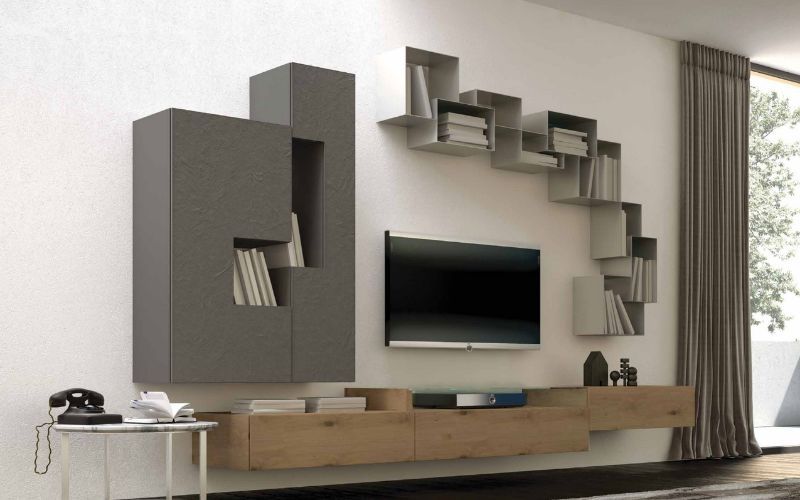 Composizione parete tv moderna di Voltan, caratterizzata dalle texture dipinte con il cemento vestono il legno di un’eleganza senza tempo: tradizione e innovazione si incontrano nel design fatto a mano.