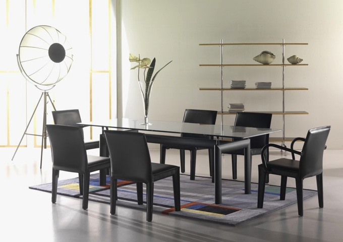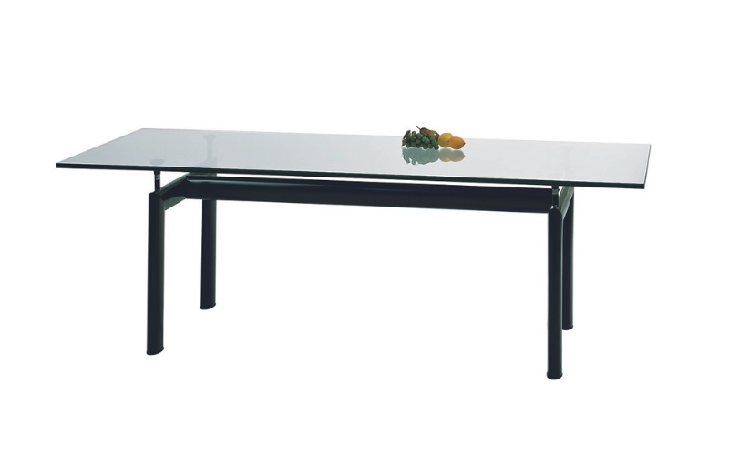 Tavolo 530, Le Corbusier, con basamento in tubo d’acciaio ellittico verniciato col. nero e piano in vetro spessore 19mm.
