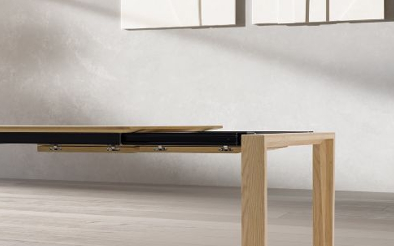- Allunghe con guide in alluminio e allunghe a libro incassate all'interno del coperchio. Stendere la venatura del legno nella stessa direzione del piano.