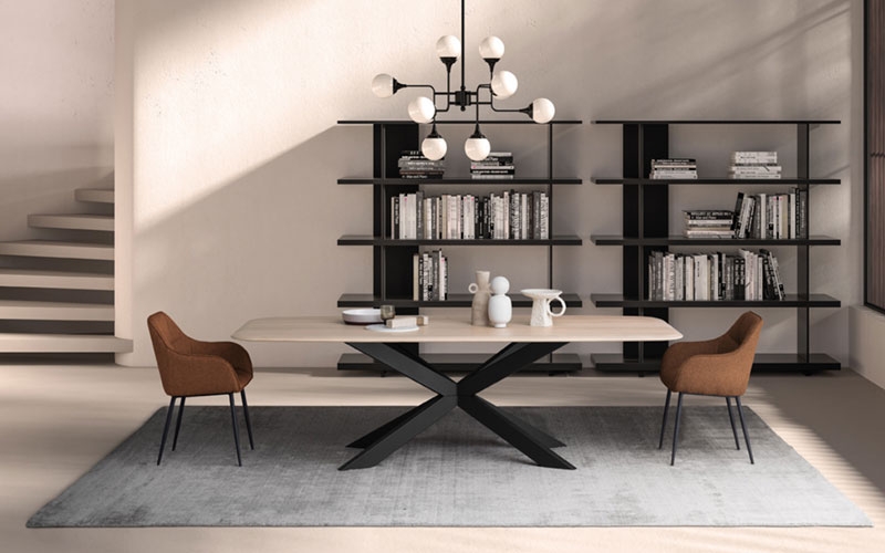 Il tavolo Copenhagen viene qui presentato nella versione con piano in finitura Rovere Materico Nordico  e gambe in ferro Star H75,3