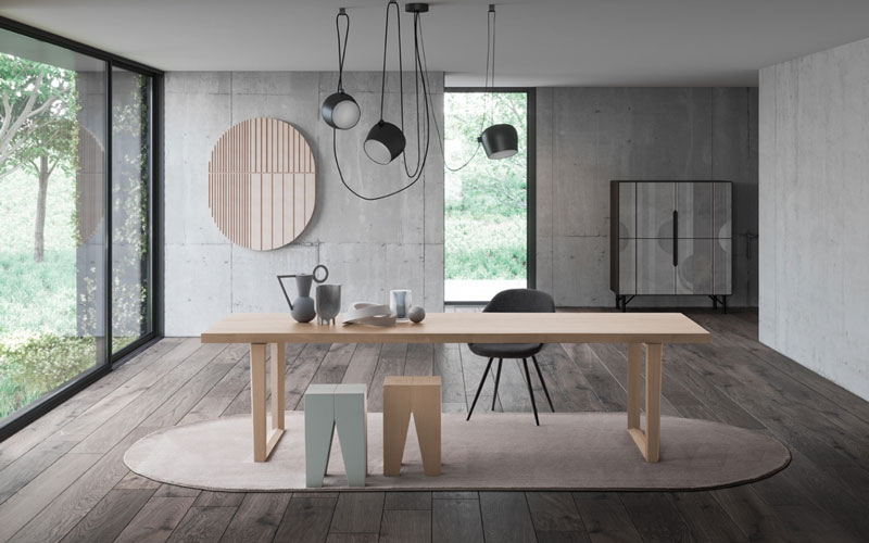 Il tavolo San Francisco viene qui presentato nella versione con piano in finitura Rovere Nordico e gambe in legno Keep H 77cm.