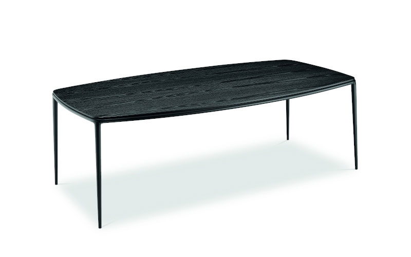 La struttura del tavolo Lea è in metallo verniciato e il top è disponibile in impiallacciato o ceramica.